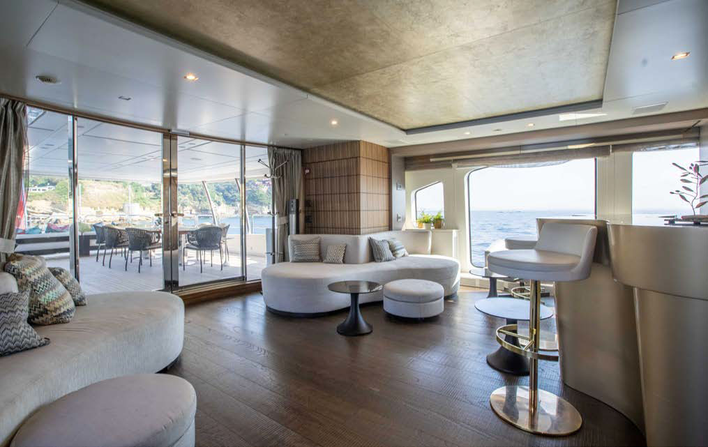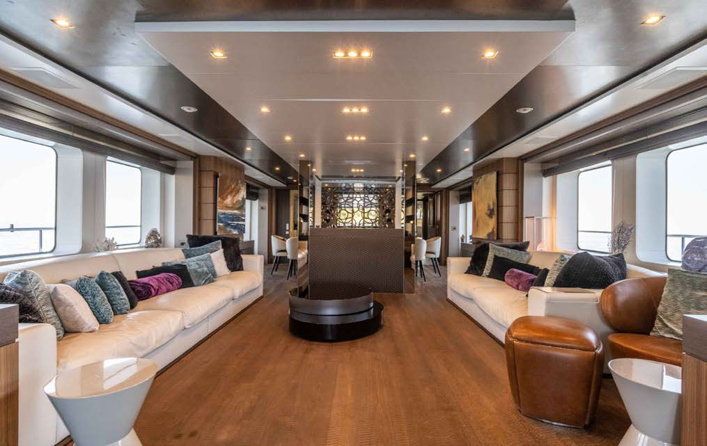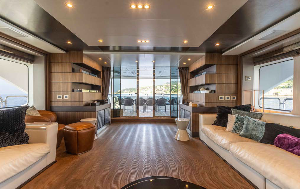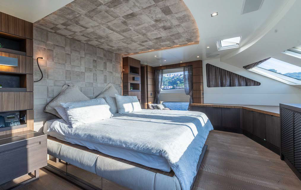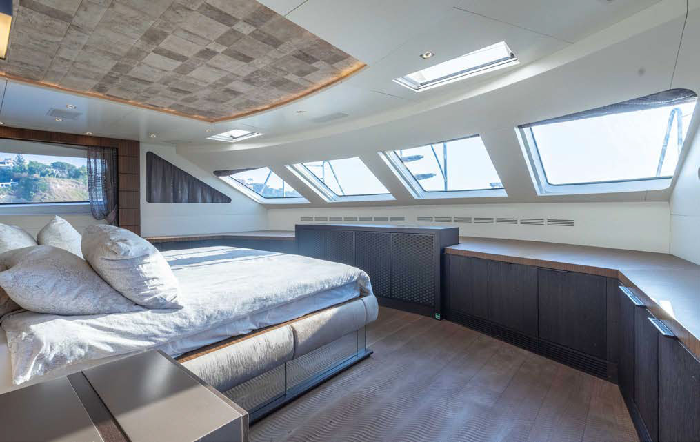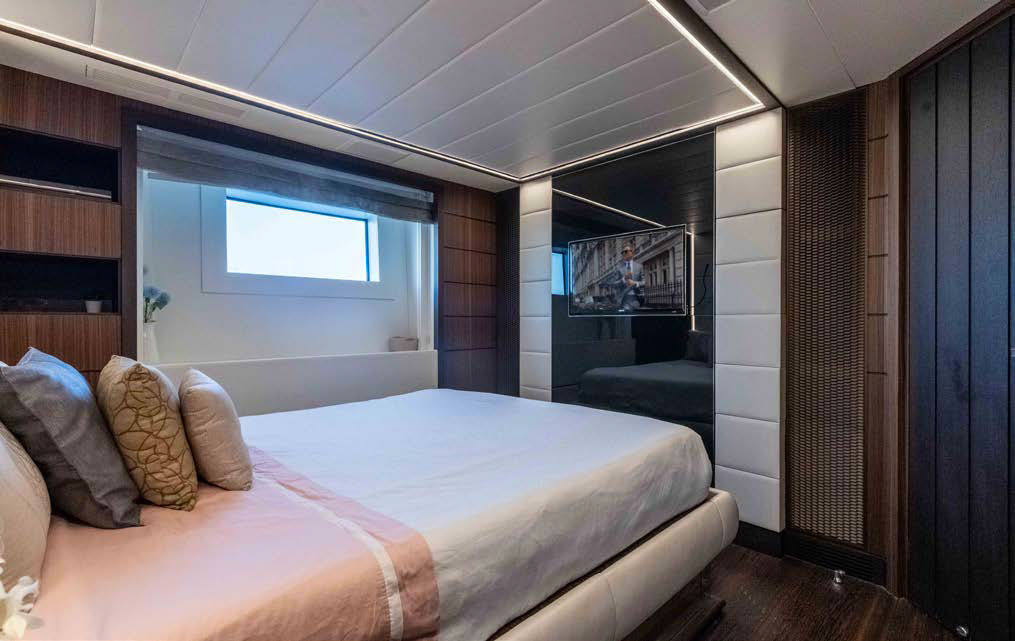 Full beam owner’s suite forward on the main deck with panoramic windows, large storage, his and her en-suite.