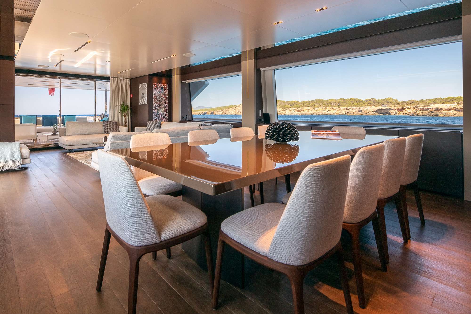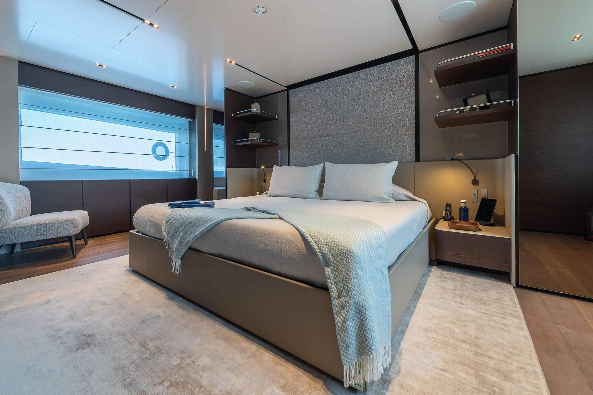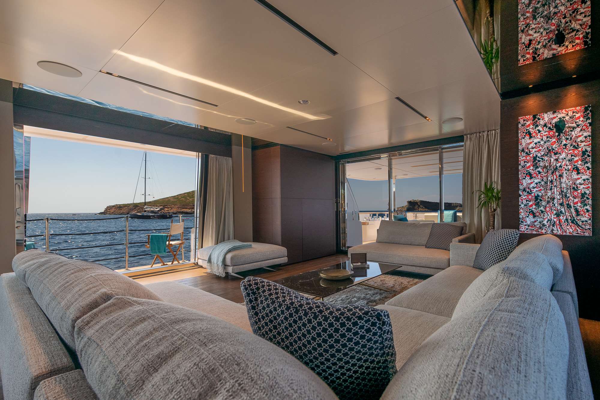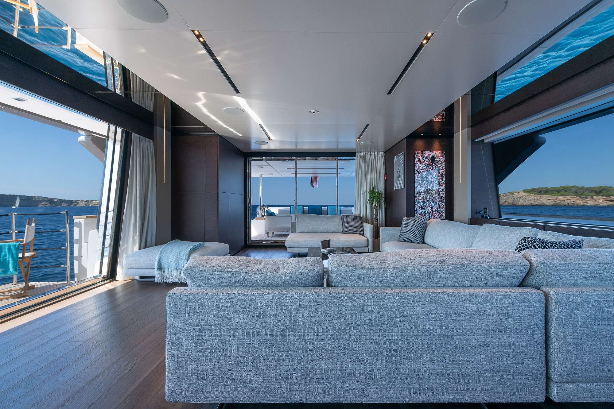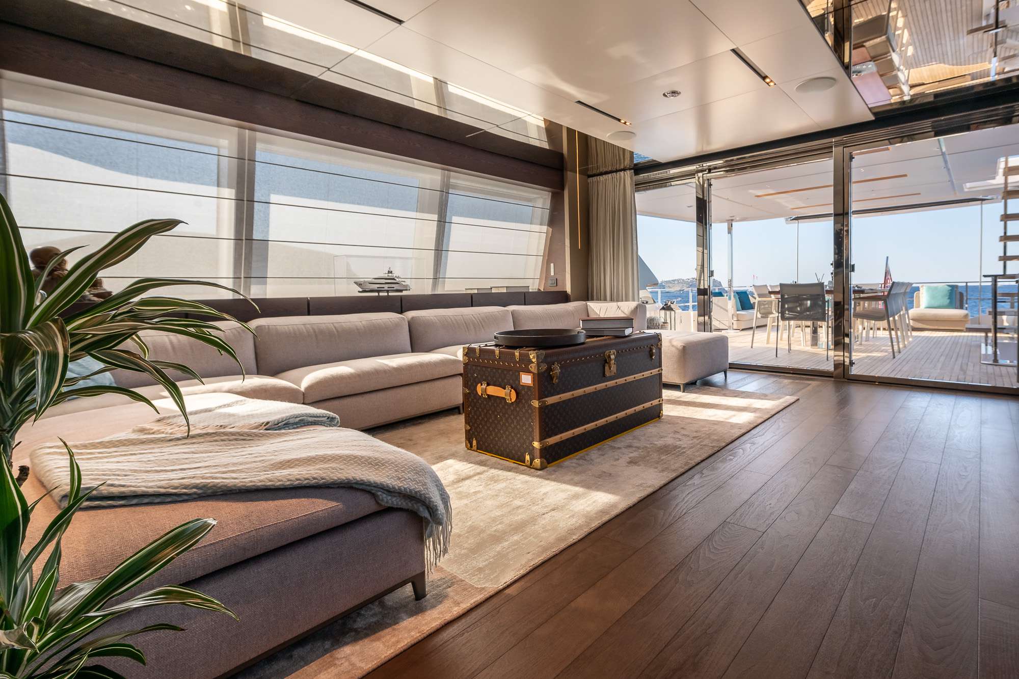 NOT INCLUDED: Louis Vuiton trunk with glass top in upper saloon, picture on wall in main cabin, vase