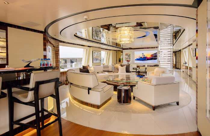The interior is an elegant blend of white marble, bleached oak, stainless, and Macassar ebony that creates a modern yet warm and welcoming environment. The large windows allowing plenty of natural light in the saloon and the cleverly designed rotating seating area allows guests to maximize the stunning views.