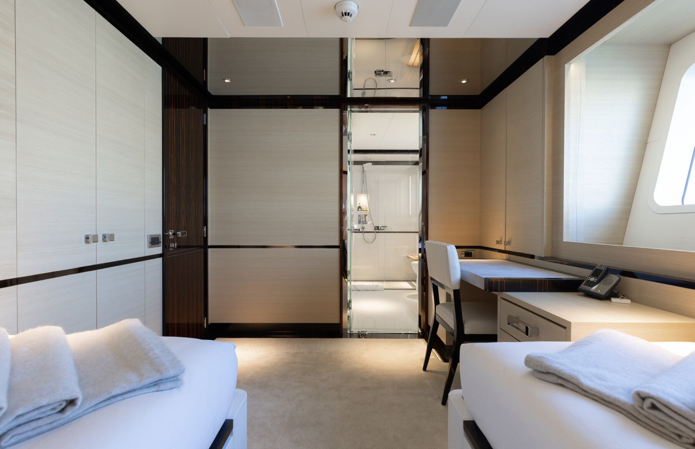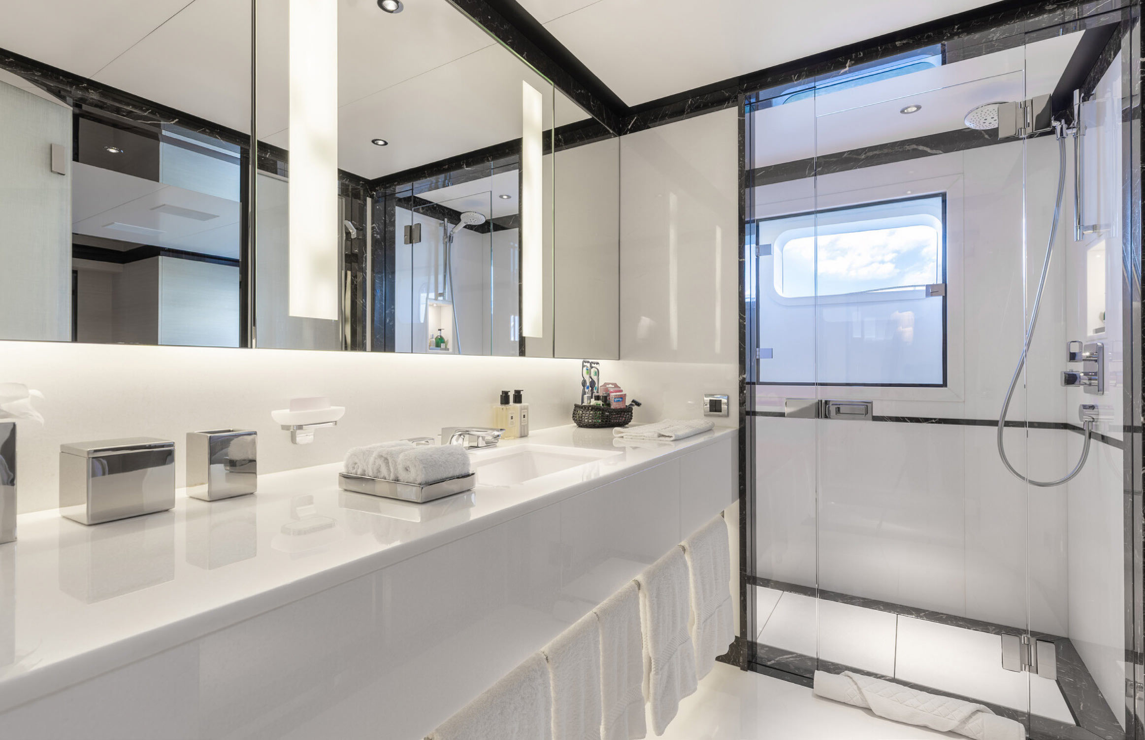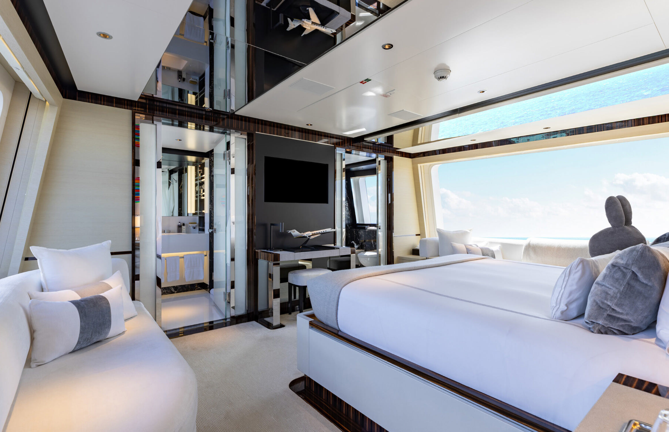 The master stateroom is located on the main deck and offers a spacious and private retreat, featuring separate His and Hers ensuite bathrooms. A generous dressing room completes the space, offering ample storage and an elegant area for wardrobe organization.