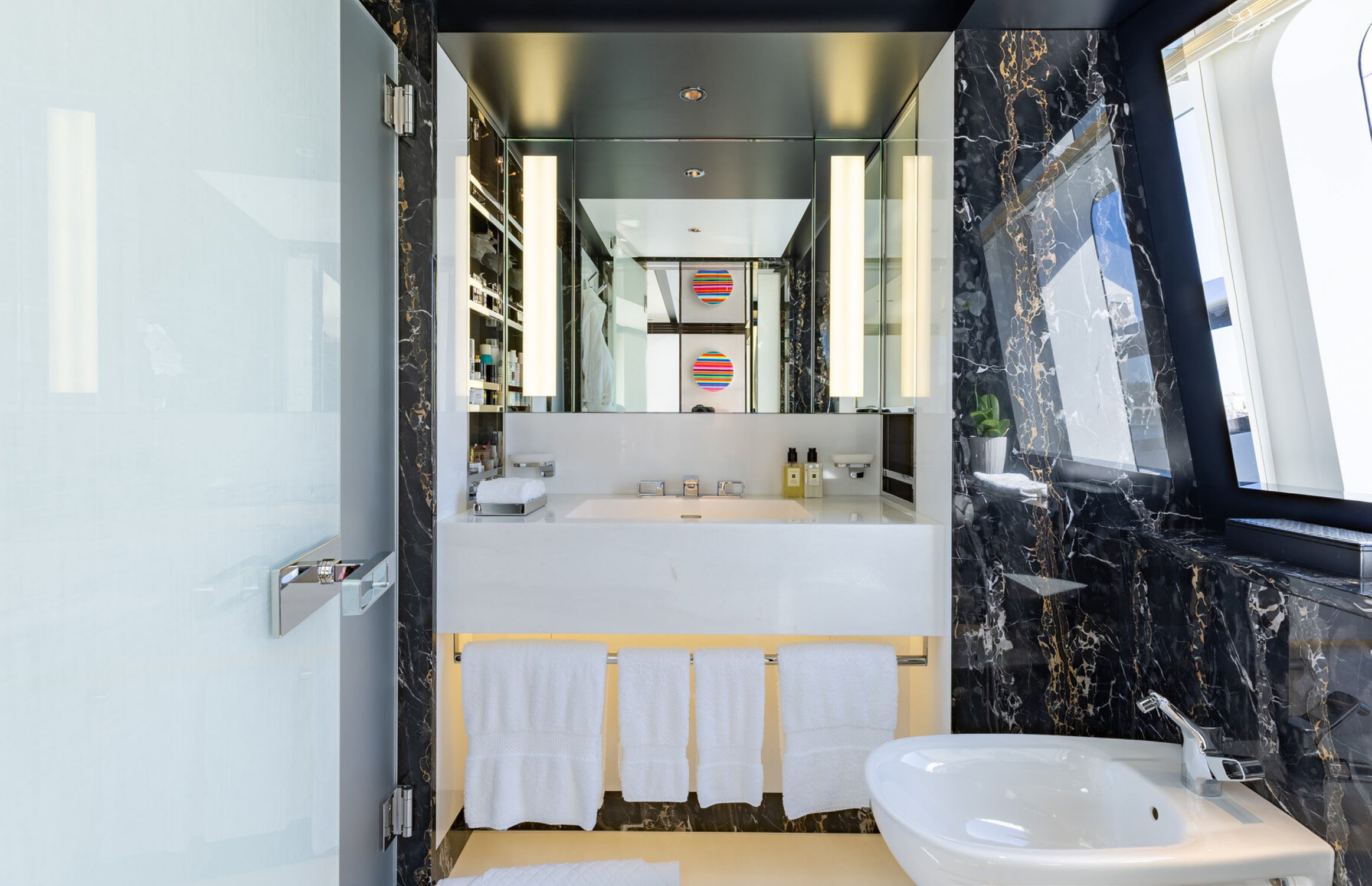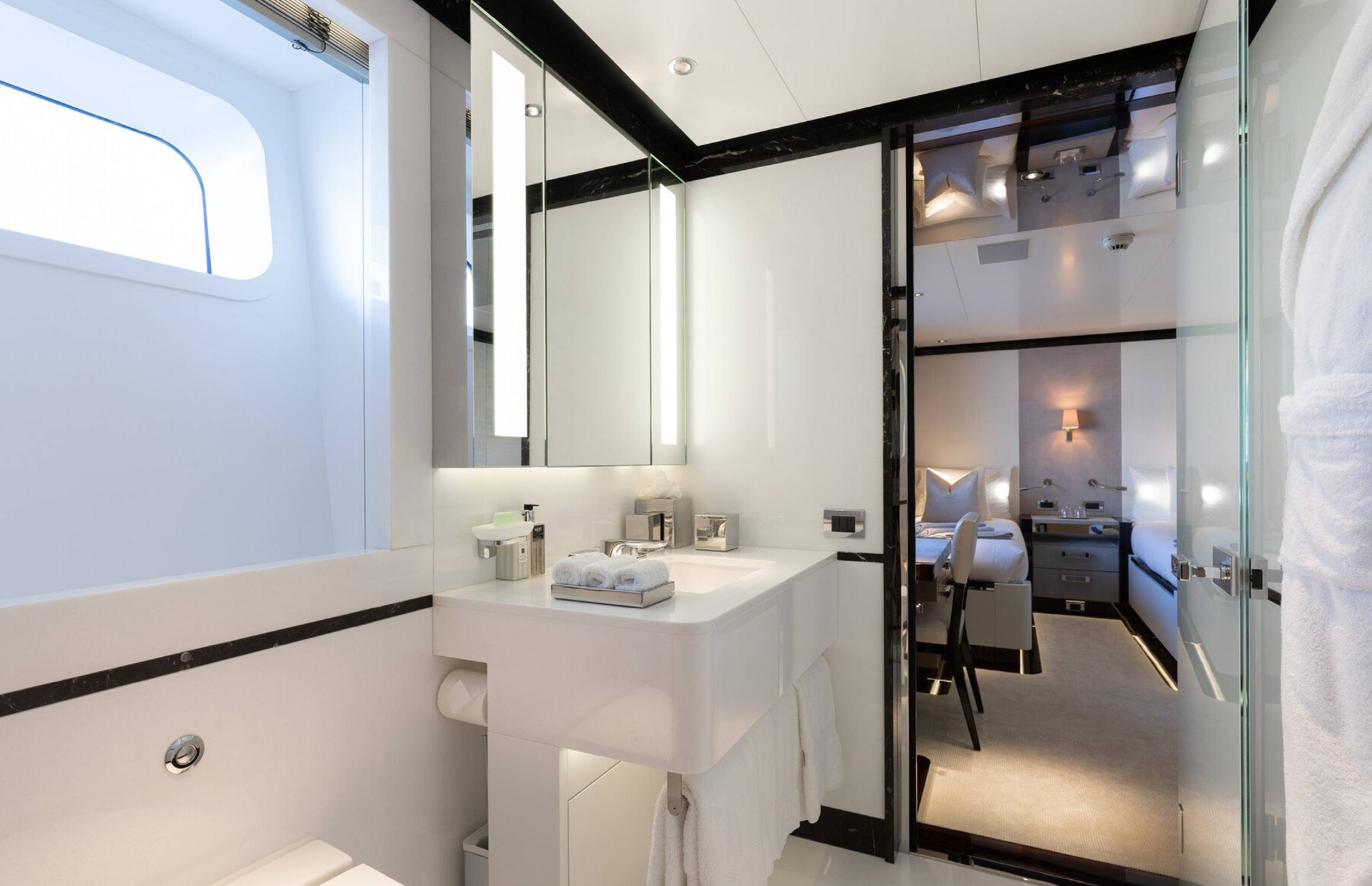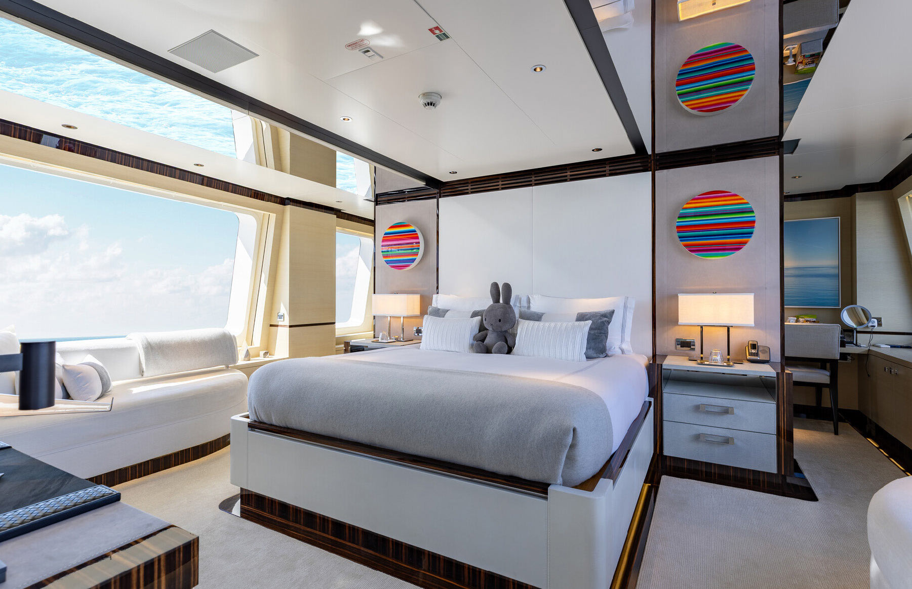The master stateroom is located on the main deck and offers a spacious and private retreat, featuring separate His and Hers ensuite bathrooms. A generous dressing room completes the space, offering ample storage and an elegant area for wardrobe organization.