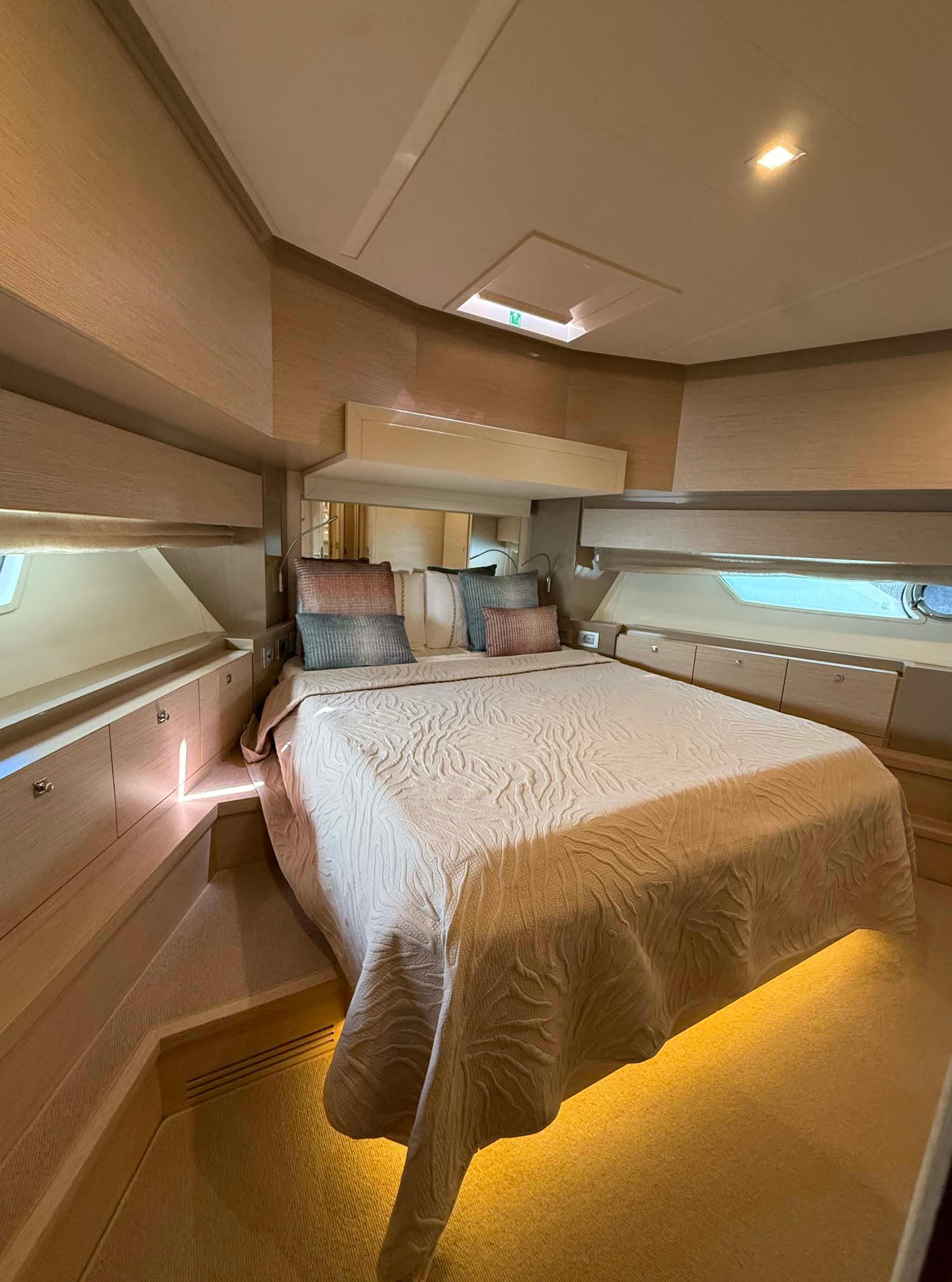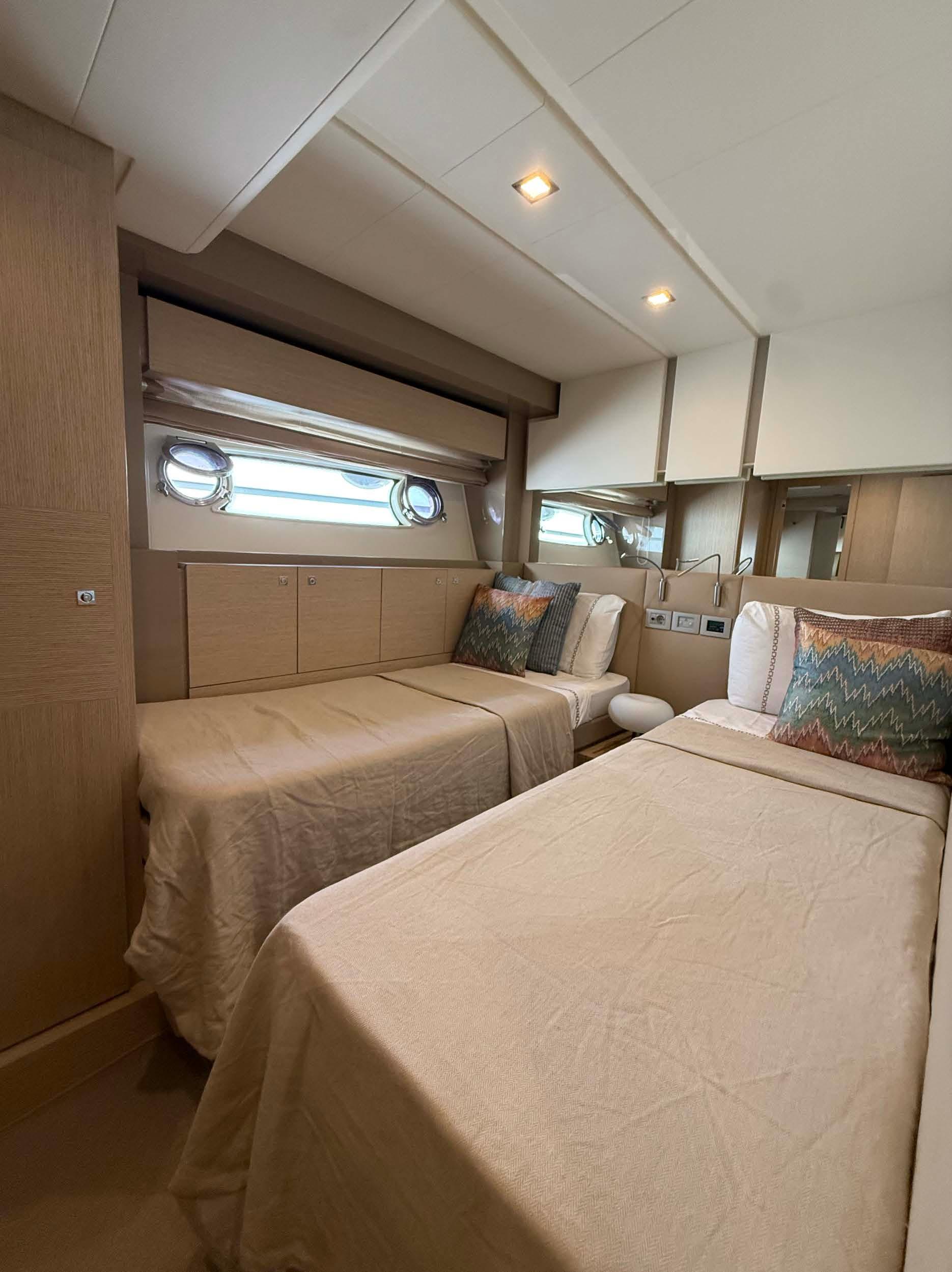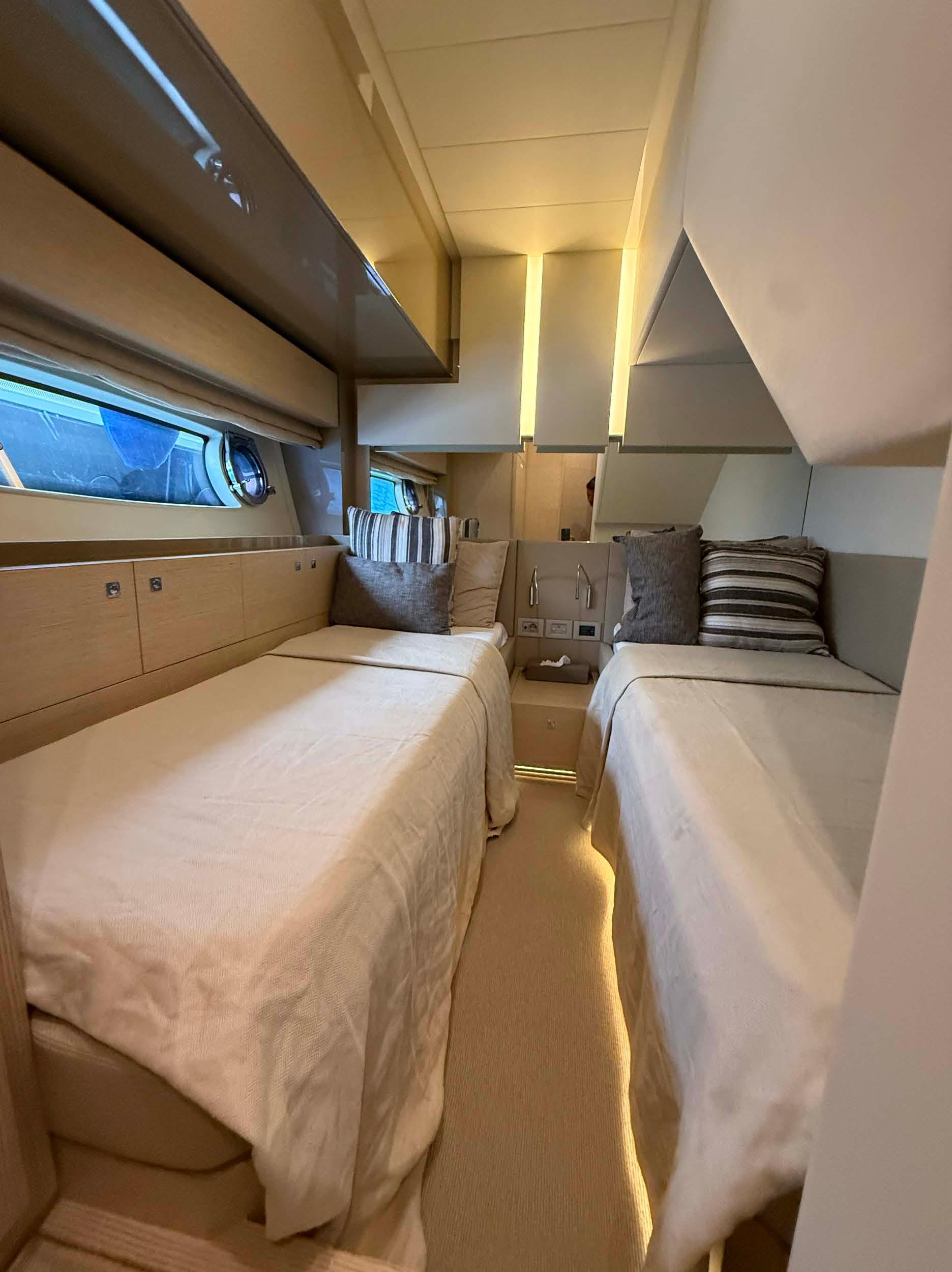 Crew cabin with bunk beds with separate access aft with bathroom.