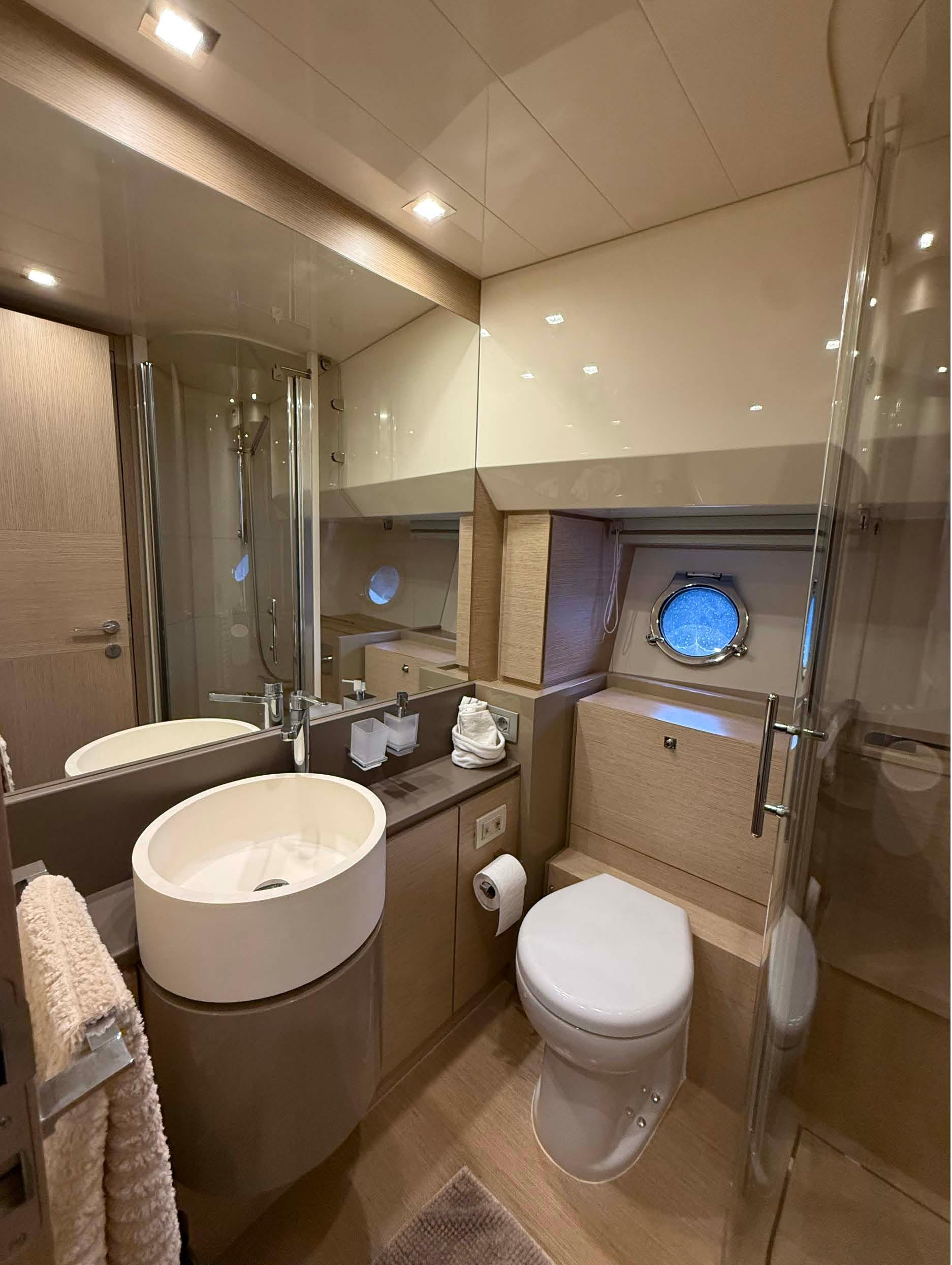 Master cabin amidships and full beam with bathroom complete with sink, toilet, bidet and shower box;