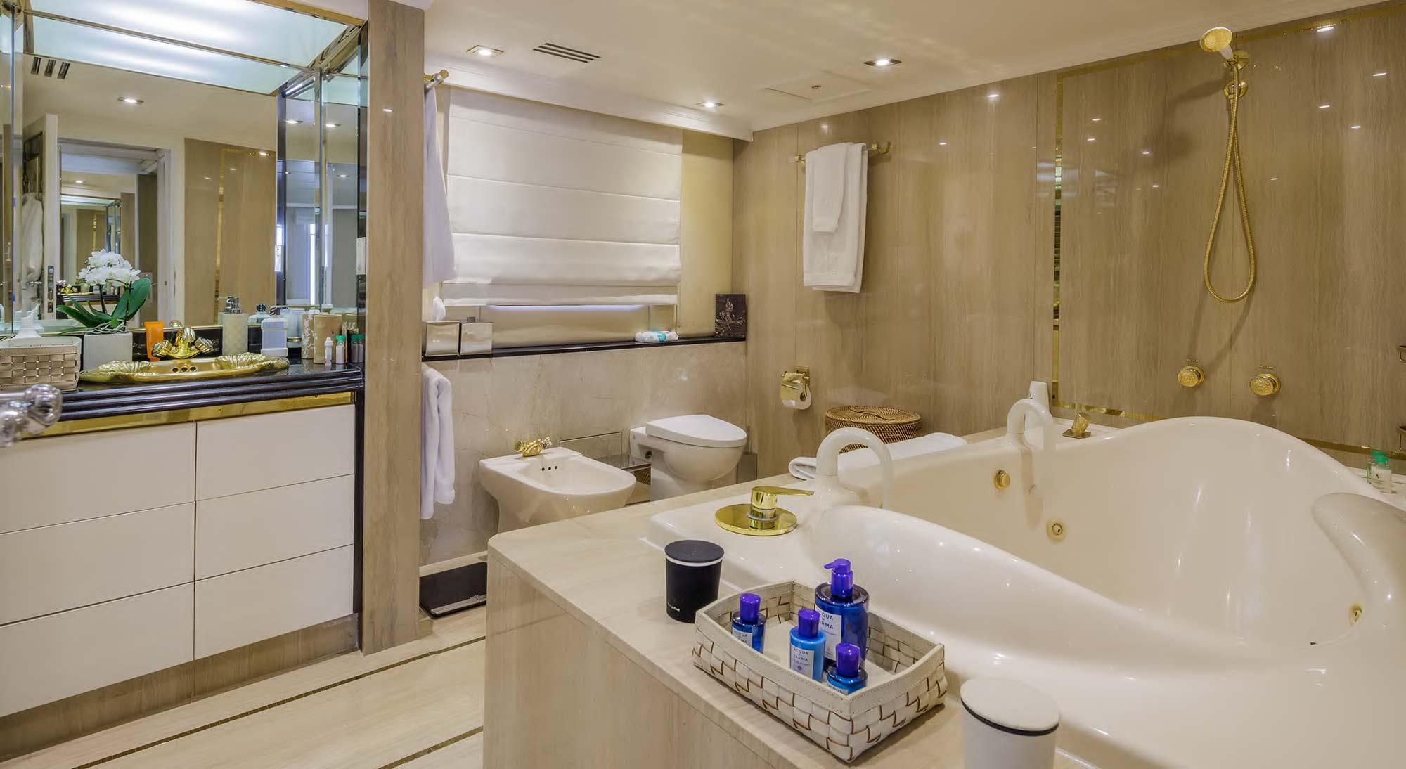 A Master Suite with a super king size bed (1.85m*2.05m) with a Wardrobe cabin and ensuite facilities (bathtub/jacuzzi & shower)
