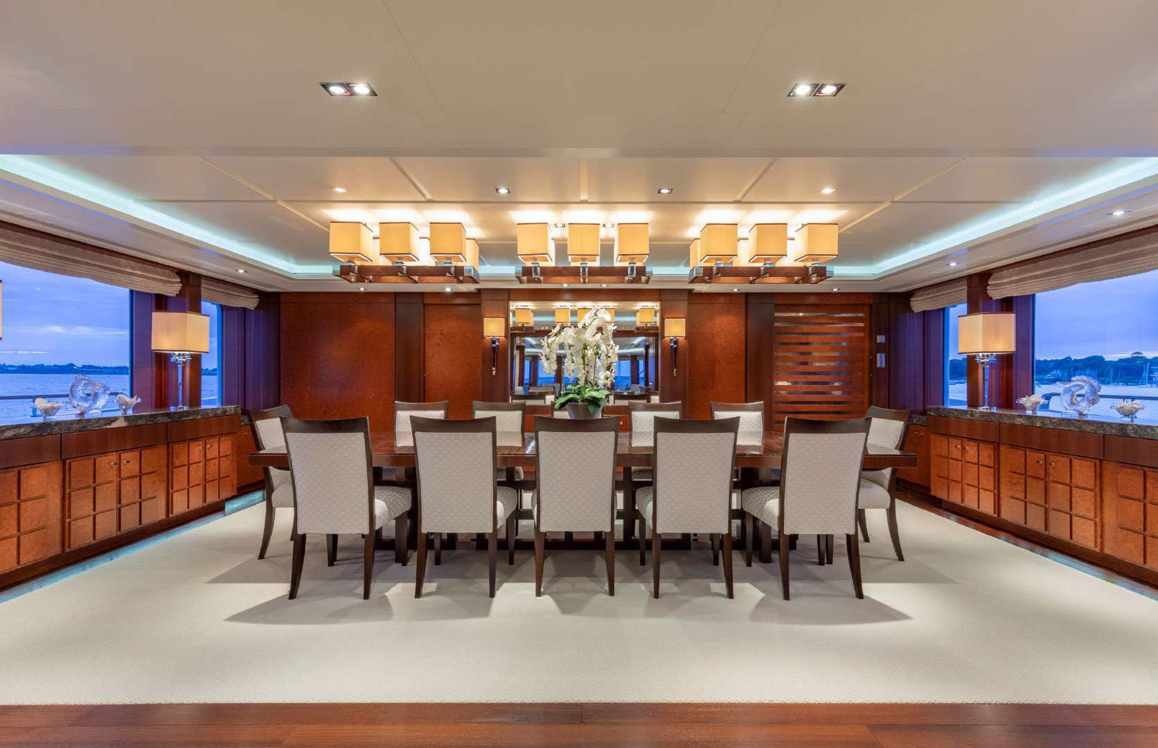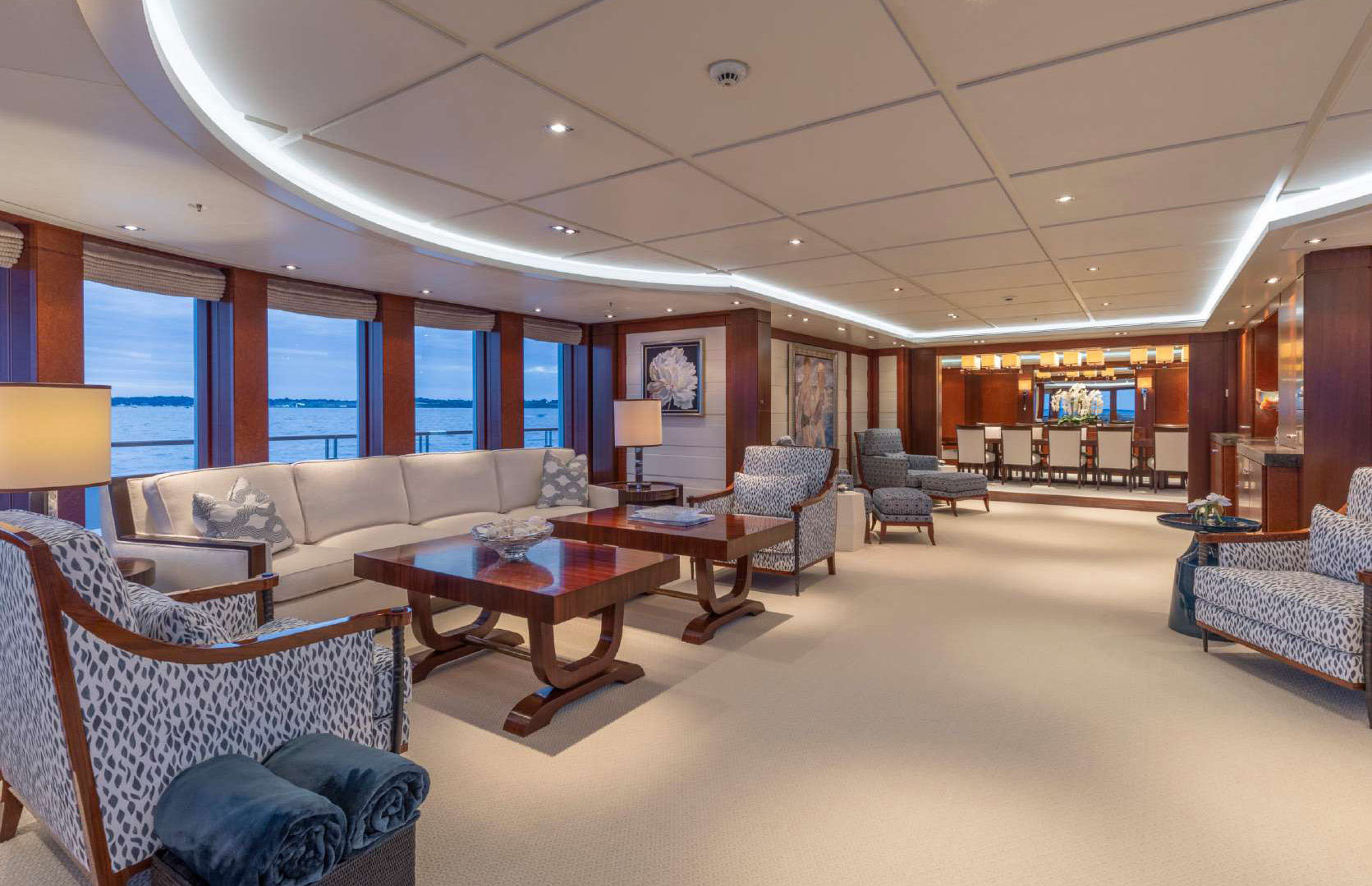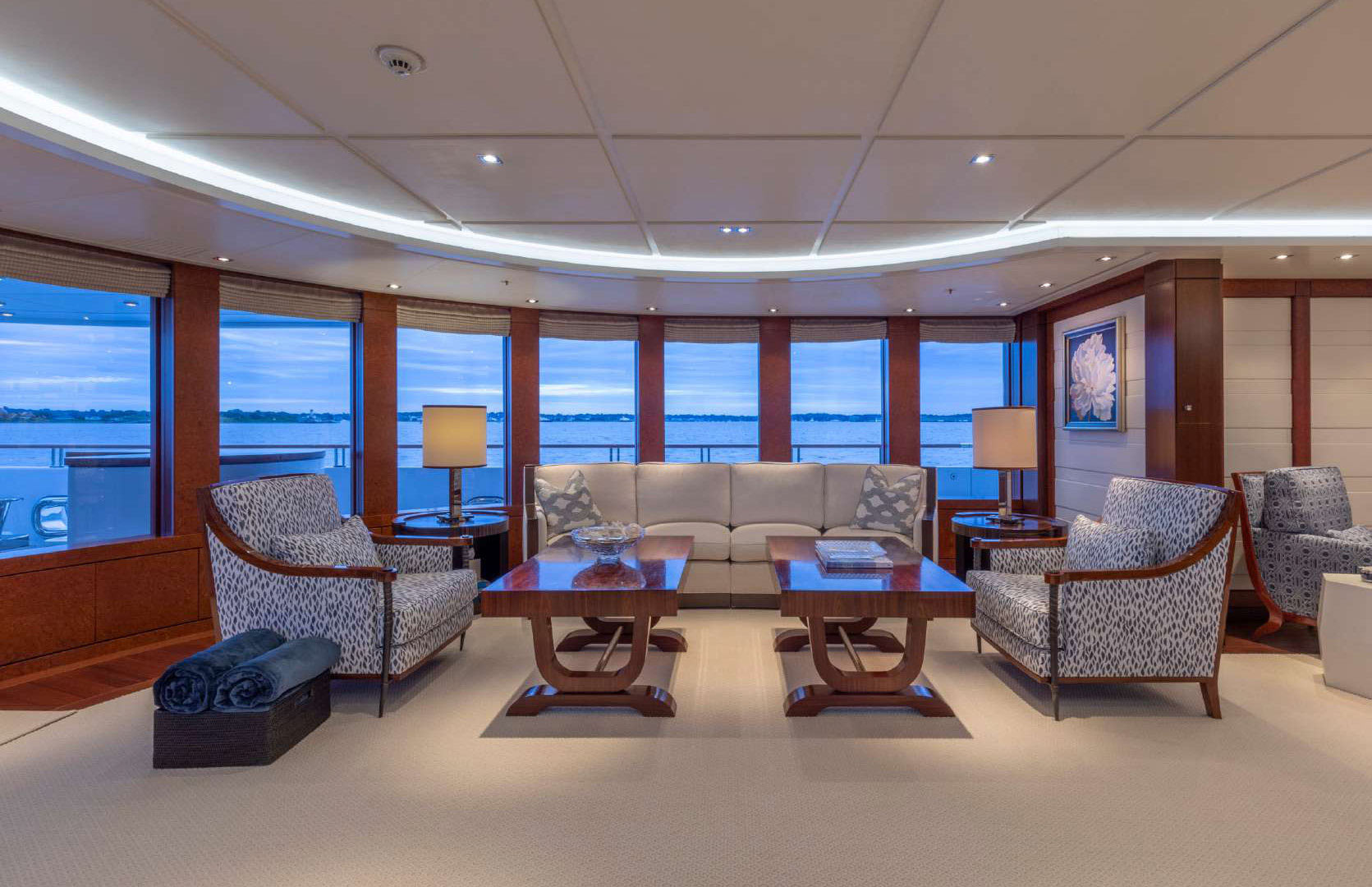 Sleeps up to 12 in 6 staterooms, Main Salon is flushed with natural light and comfortable textures. The modern combination of handcrafted woods, contrasting fabrics and expert lighting make this a grand room for social gatherings. Lighting, window treatments and audio visual systems are all controlled with iPad integrated remote controls.