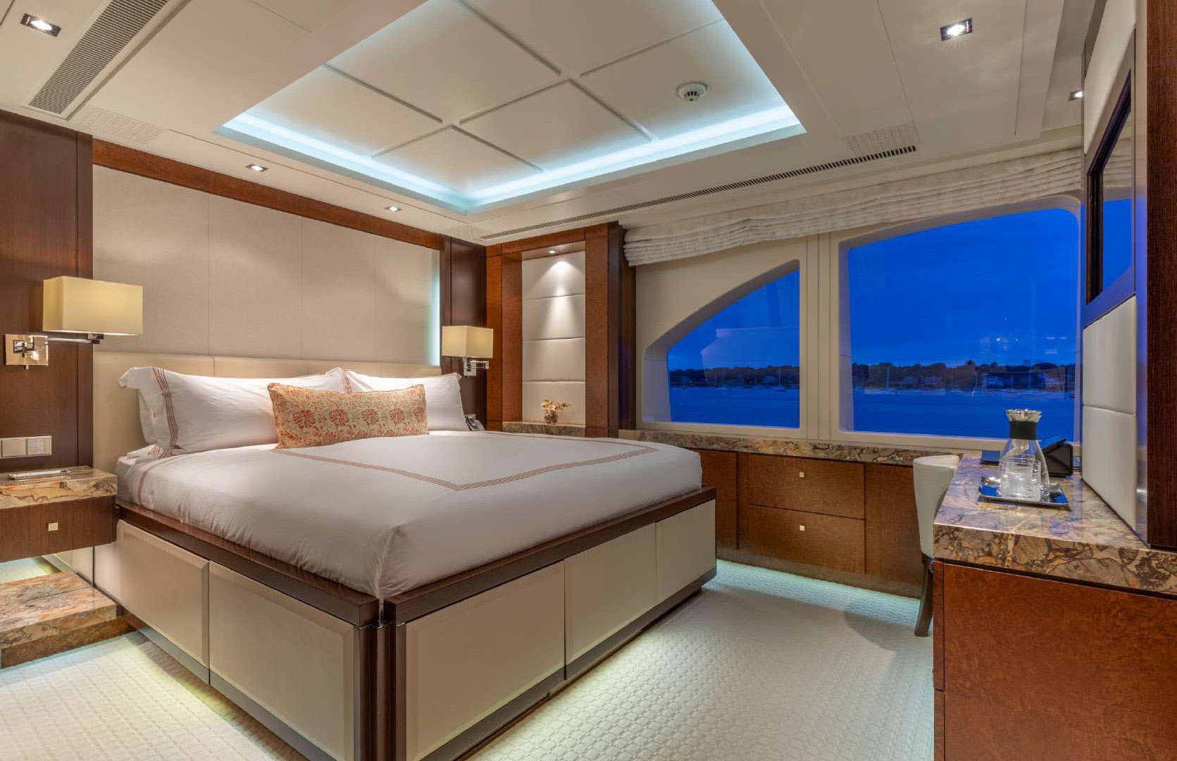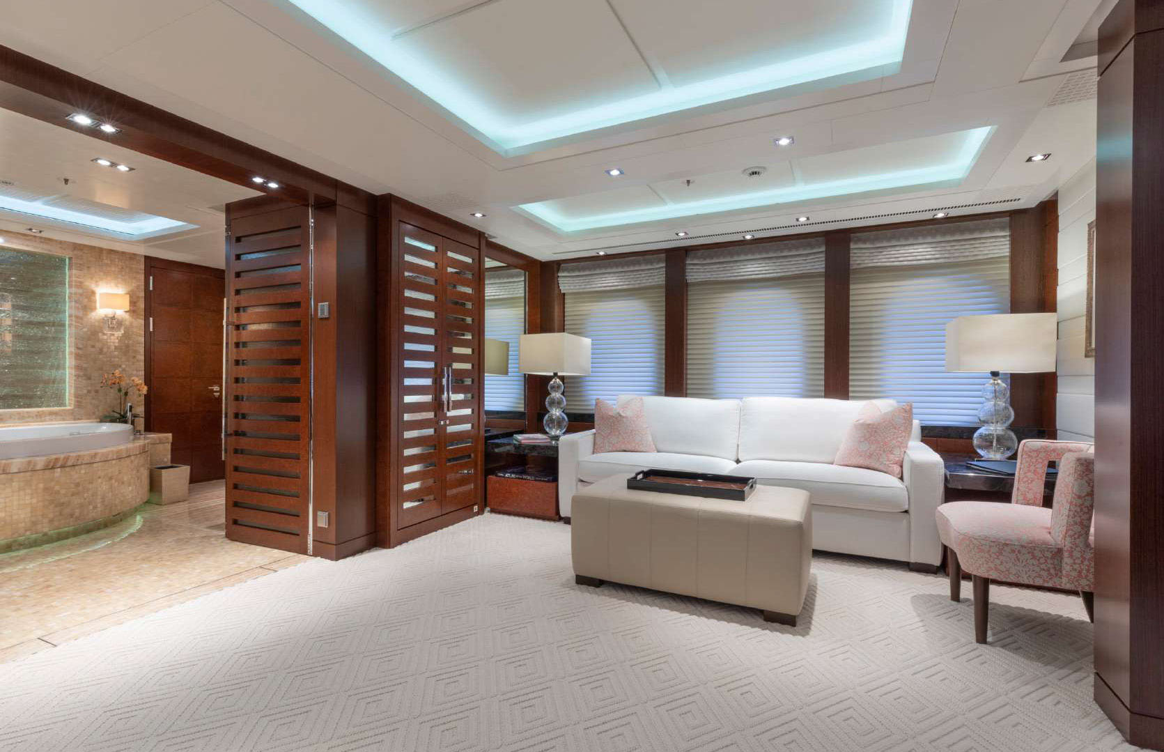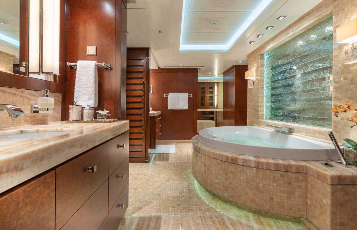 The full beam master suite, located on the main deck, is flooded by natural light from 6 large oval windows highlighting a generous seating area and stately king sized mattress in black beauty anigre frame. A Sony 70” LED HD TV provides access to movies onboard and expertly designed lighting provides a rich and exotic ambiance. The en suite master bathroom includes a Jacuzzi tub with an inviting décor of dark handcrafted wood and marble flooring framing dual vanities. The aromatherapy shower is big enough for two.