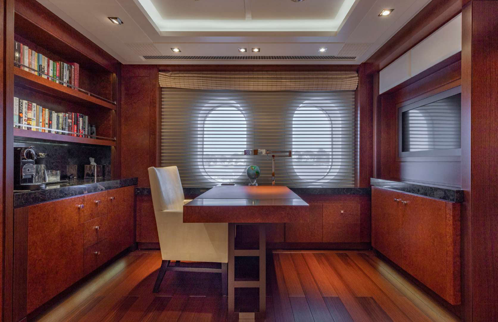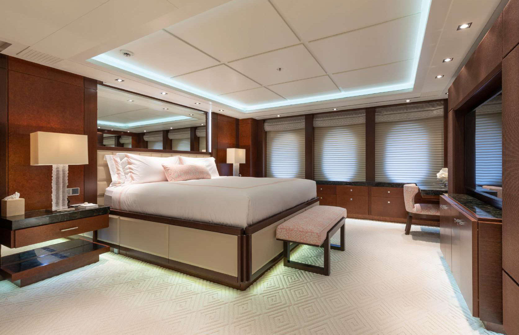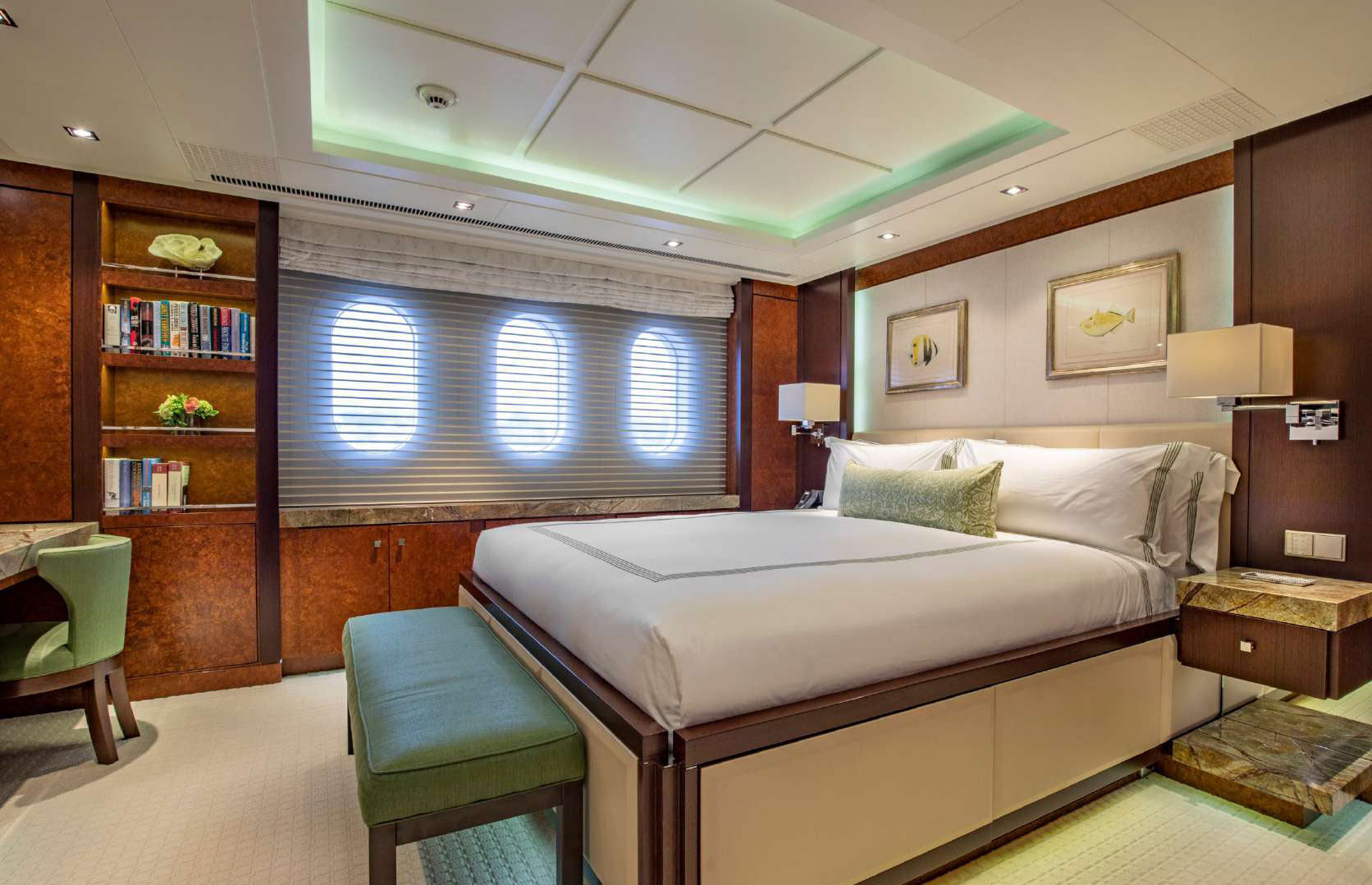 The full beam master suite, located on the main deck, is flooded by natural light from 6 large oval windows highlighting a generous seating area and stately king sized mattress in black beauty anigre frame. A Sony 70” LED HD TV provides access to movies onboard and expertly designed lighting provides a rich and exotic ambiance. The en suite master bathroom includes a Jacuzzi tub with an inviting décor of dark handcrafted wood and marble flooring framing dual vanities. The aromatherapy shower is big enough for two.