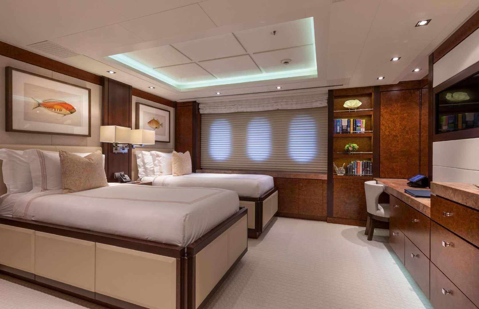 The VIP suite is located on the bridge deck and is contemporary in style. The 4 guest staterooms are located on the lower deck, two double and 2 twin staterooms. The two double guest staterooms are the same and the two twin guest staterooms are the same.