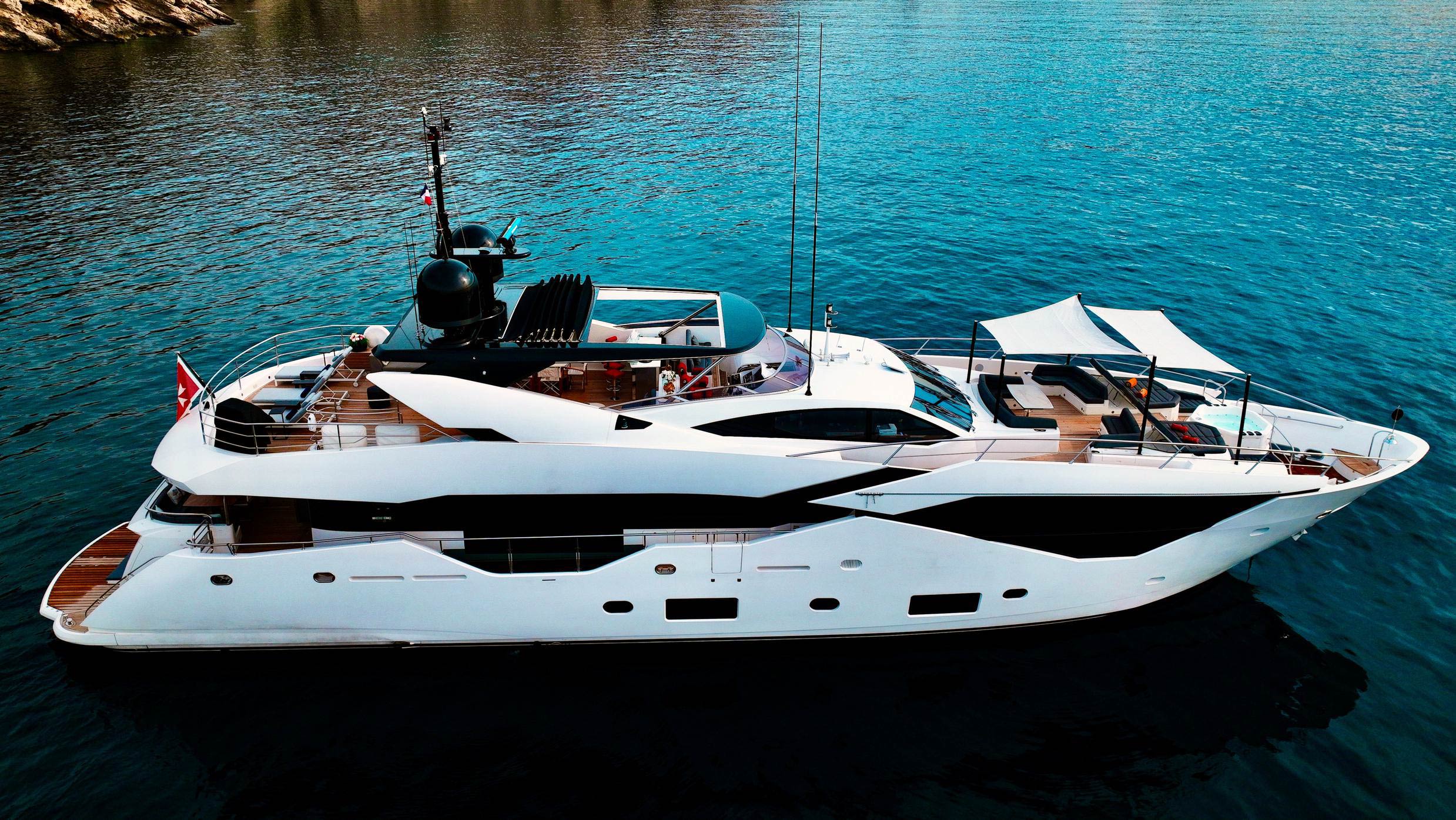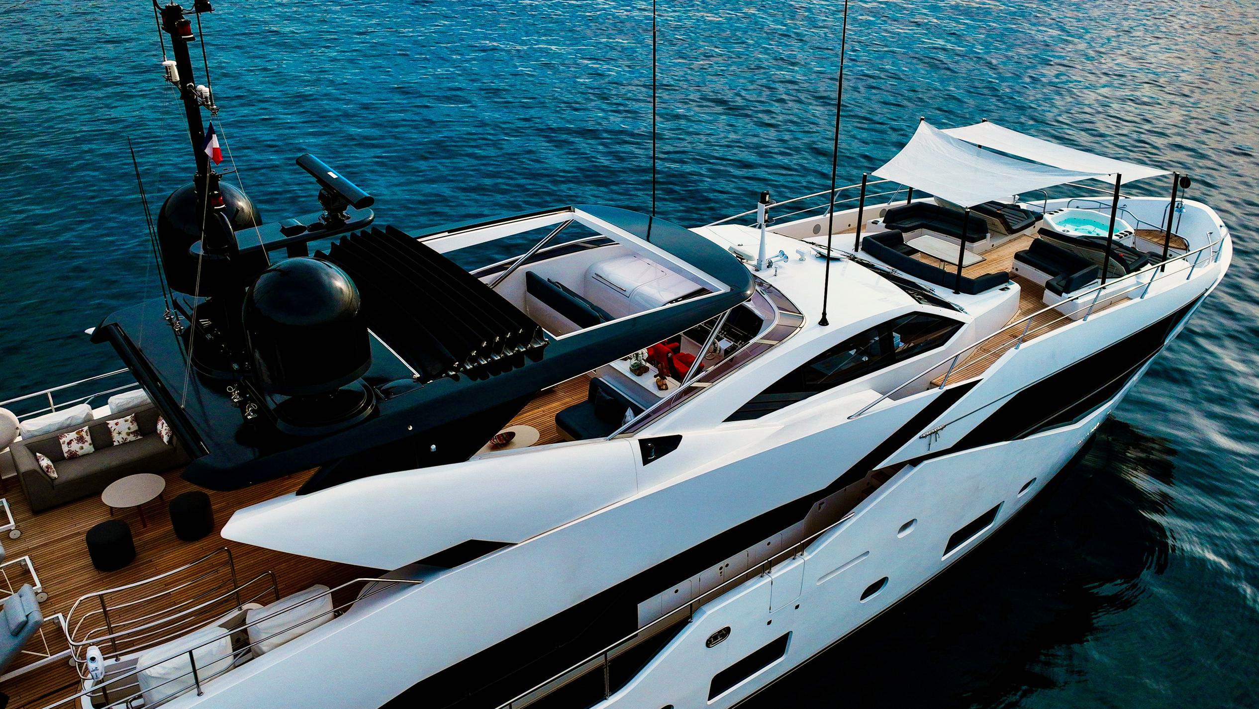 › Fore Deck sail canopies fitted for the wheelhouse deck seating area and main sunpad (does not cover forward deep seats).