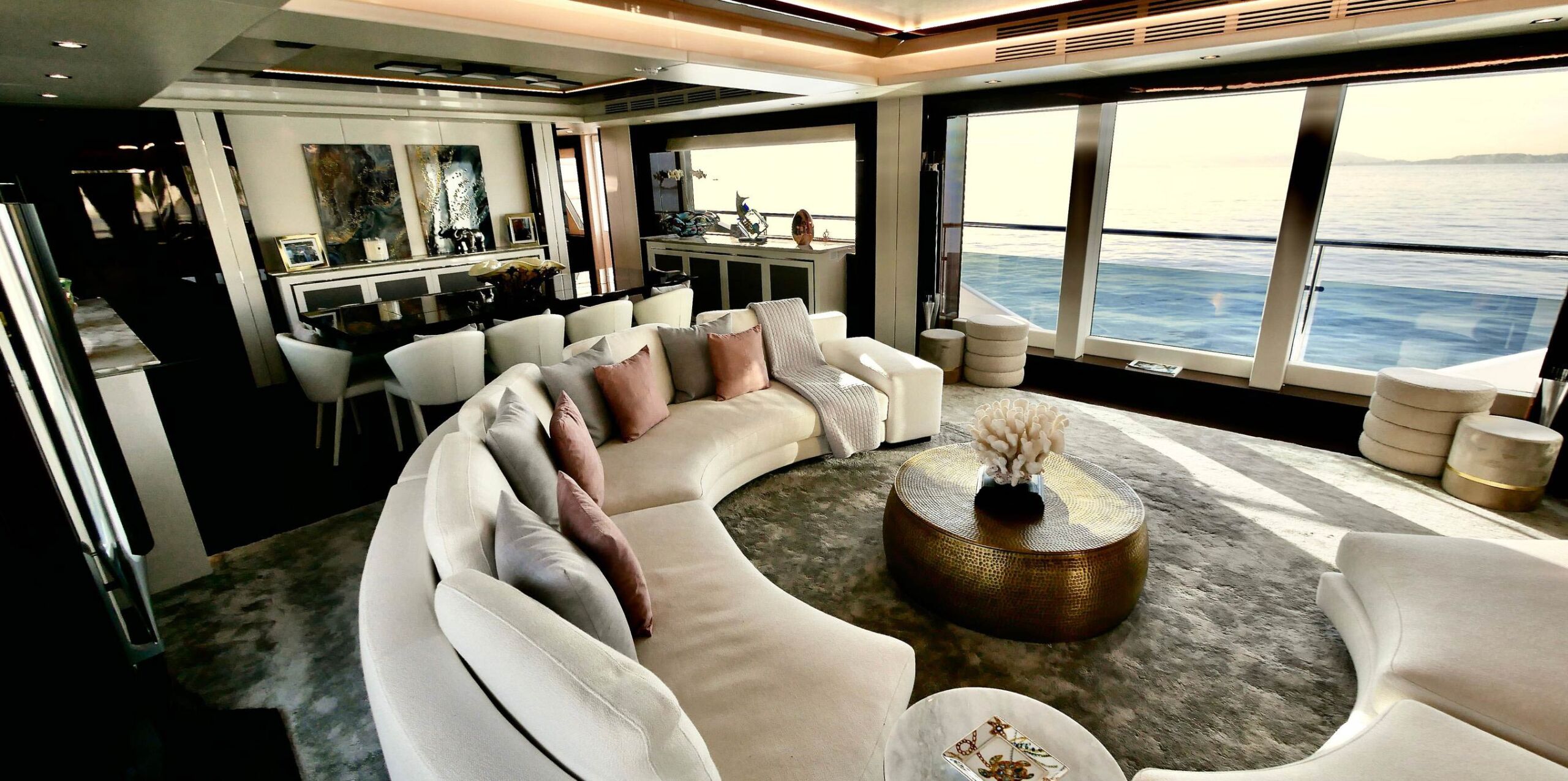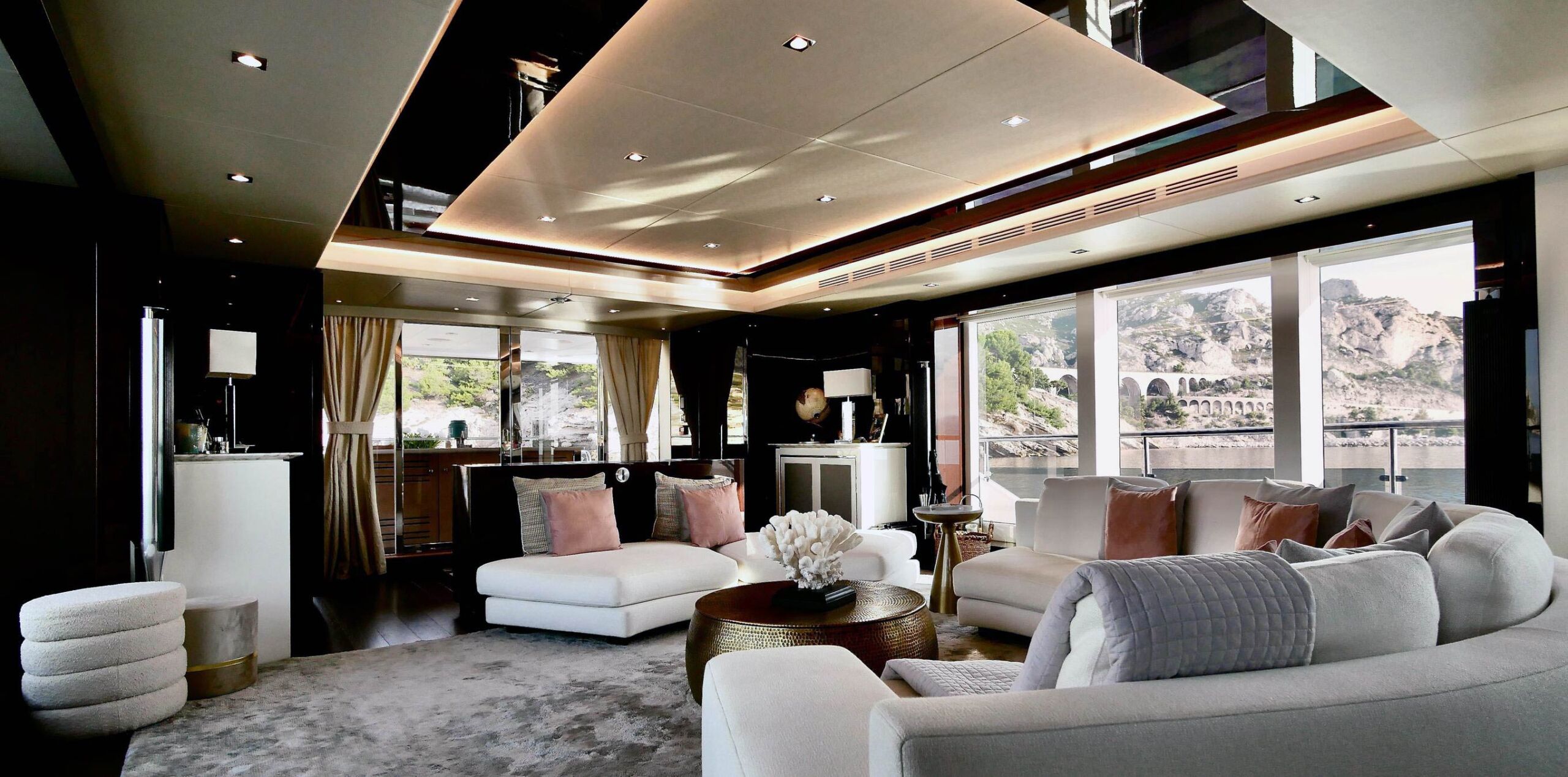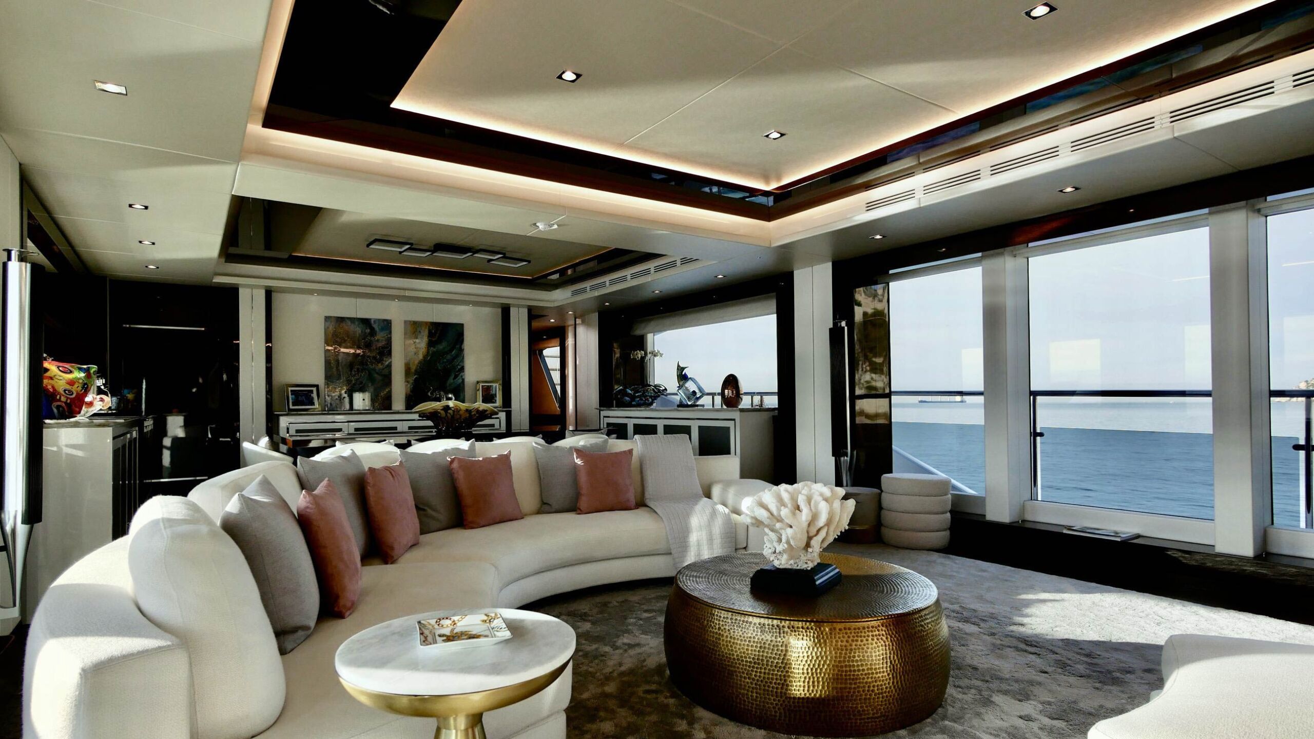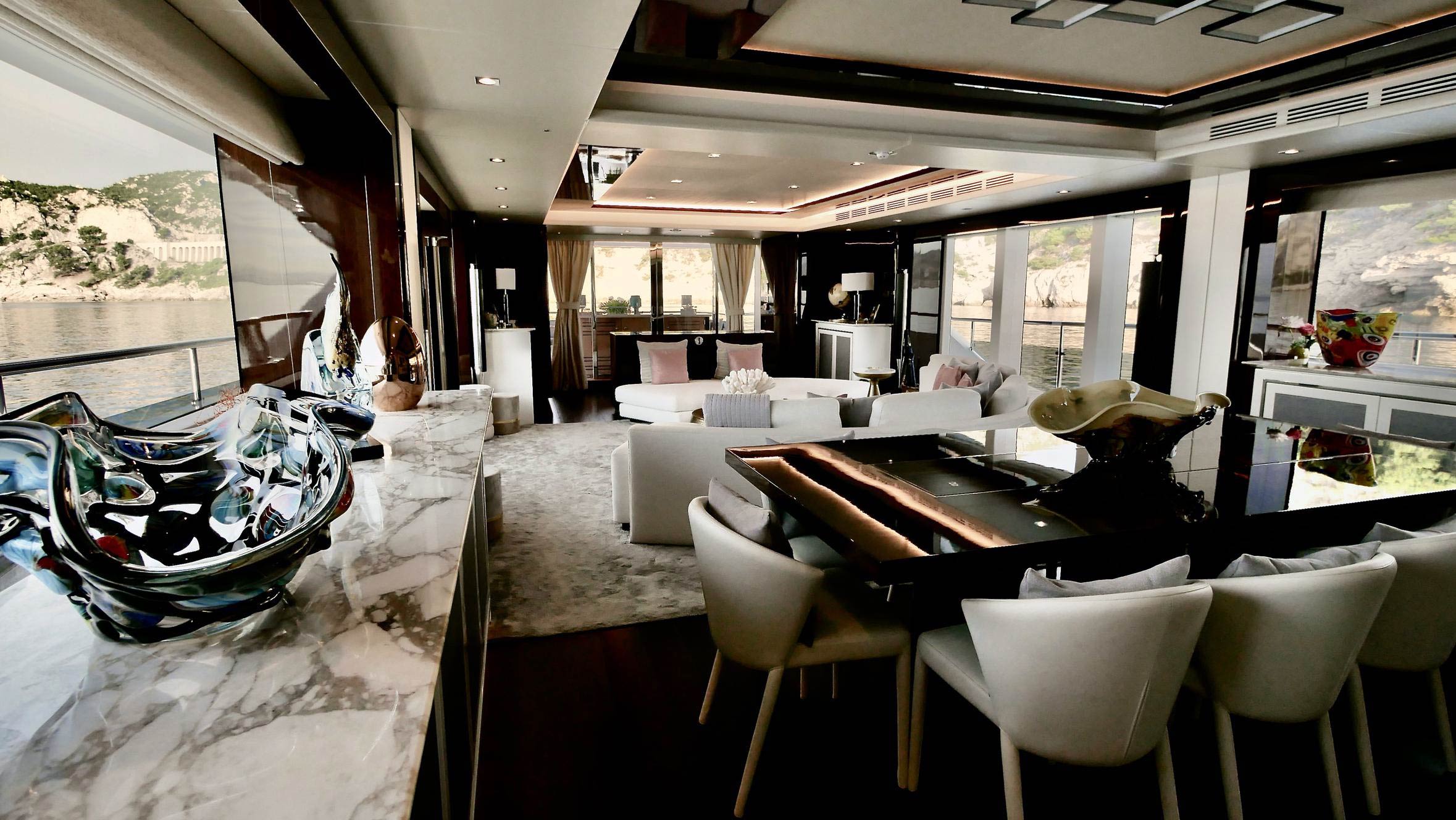› Main Deck Saloon console units, Port & Stbd Dining console, Forward dining console unit and TV rise and fall unit has recess designed in to incorporate concealed LED rope lighting at low level.