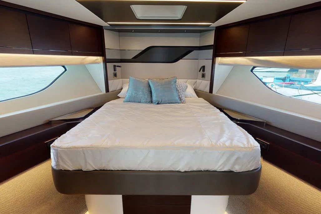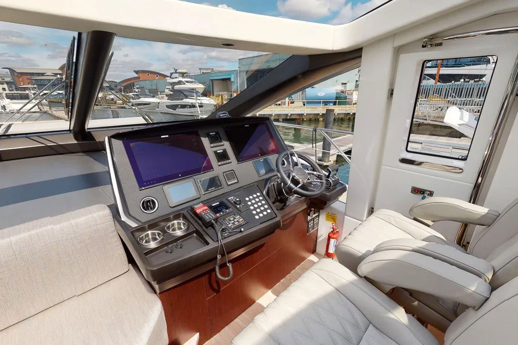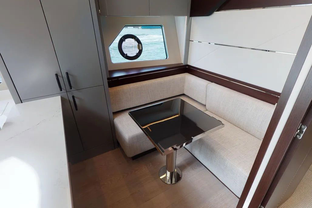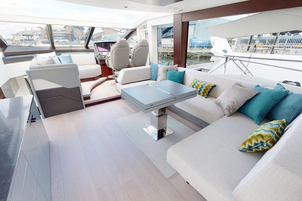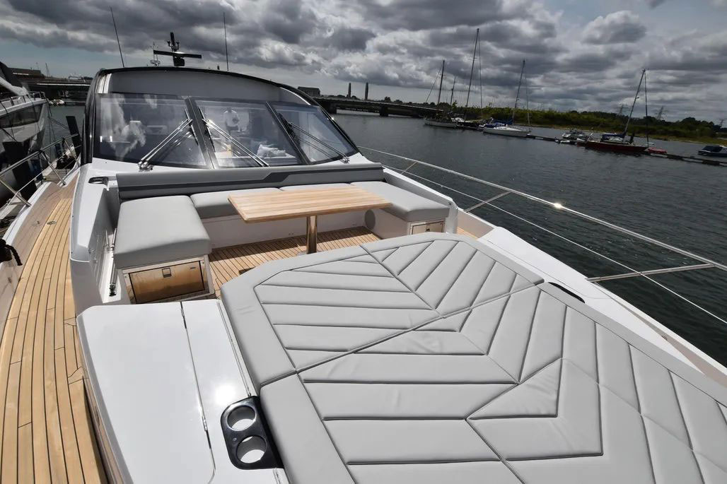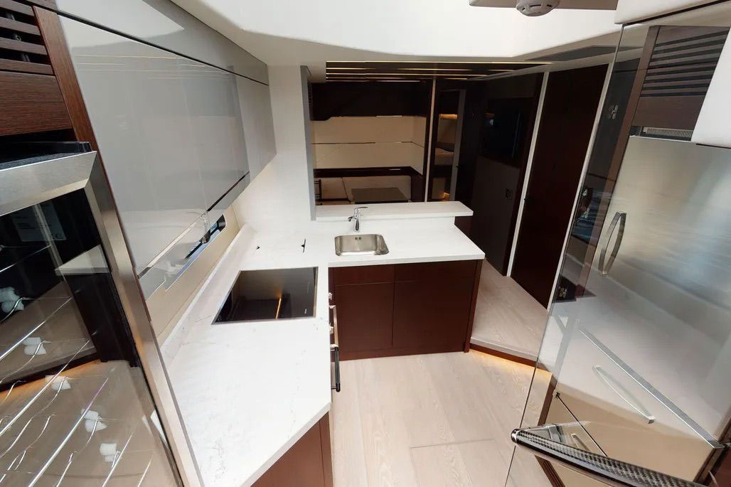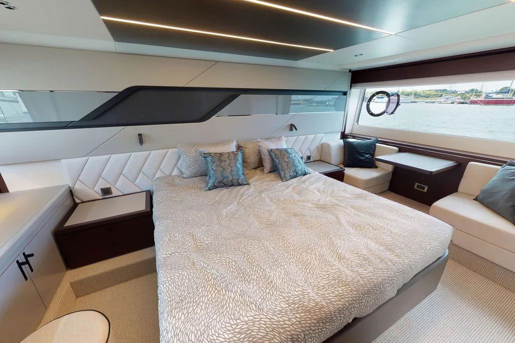 Superb fitted out cockpit with large sunbed, u shape sofa with table, saloon with 2 seating areas and table, complete helm station and above large openable hard top with glass. Bow area with seating, table and sunbed. Lower deck there mis the galley and seating area with table in front of wall mounted tv. Accommodation for 6 guests in 3 cabins all ensuite. Doble crew cabin and garage accommodating tender.